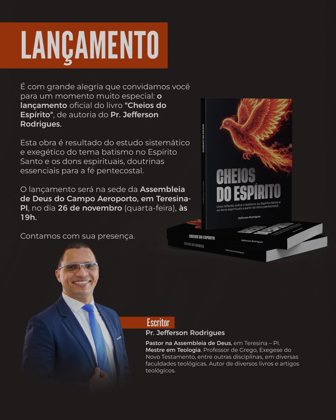 O pastor e teólogo Jefferson Rodrigues lança sua mais recente obra, “Cheios do Espírito”, um estudo teológico e exegético que aborda de forma profunda e acessível a doutrina do batismo no Espírito Santo e os dons espirituais descritos nas Escrituras, especialmente sob a perspectiva pentecostal.